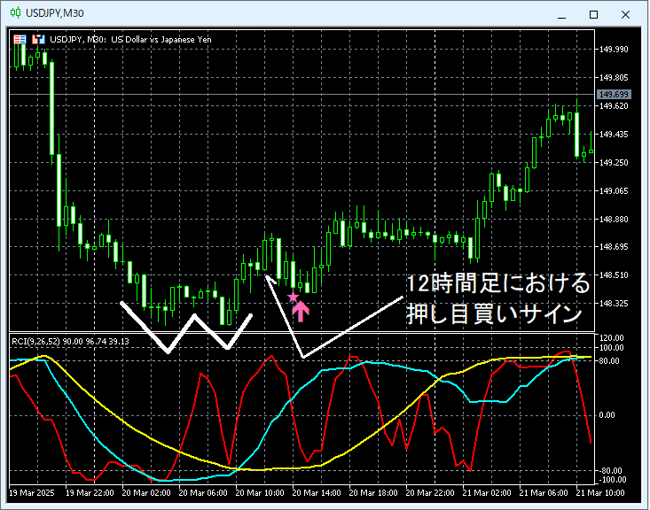 【MT5】ドル円 複数のタイムフレームにおけるmBDSR(RCI2本フィルター)の押し目買いサイン