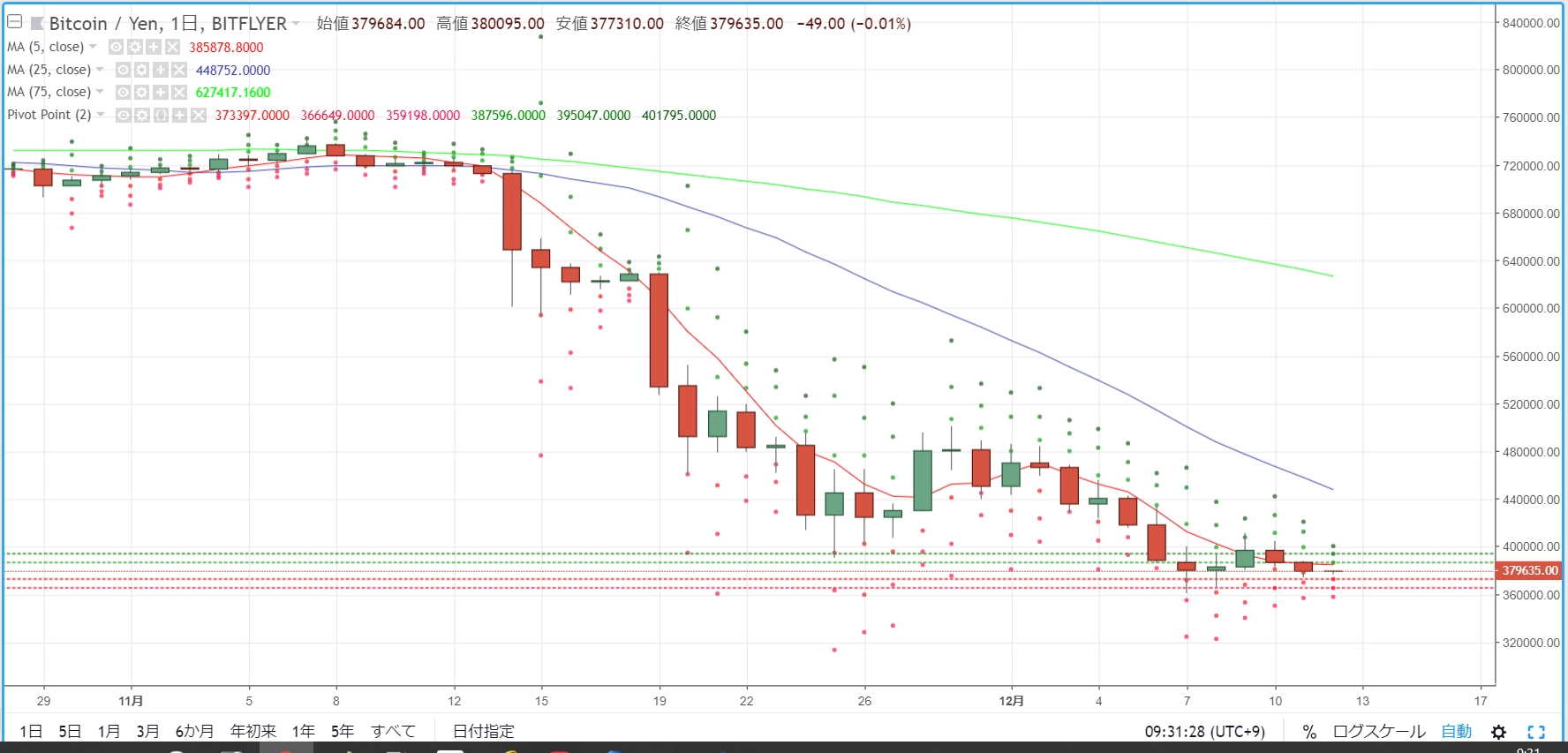 BTCJPYでデイトレする目安として、ピボットを確認します。昨日(12月12日)も小動きに終始。11日に下げた分を取り戻し、38万円台後半でクローズした相場環境でした。