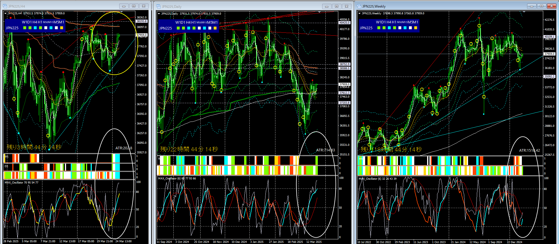一方で、週足のMAXオシレーター、シンクロバンドも弱い上昇に変化。
