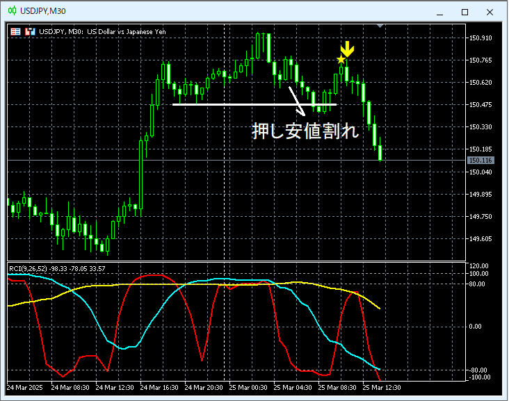 【MT5版】押し安値割れとmBDSR(RCI2本フィルター)の戻り売りサイン 昨夜(2025年3月25日)のドル円
