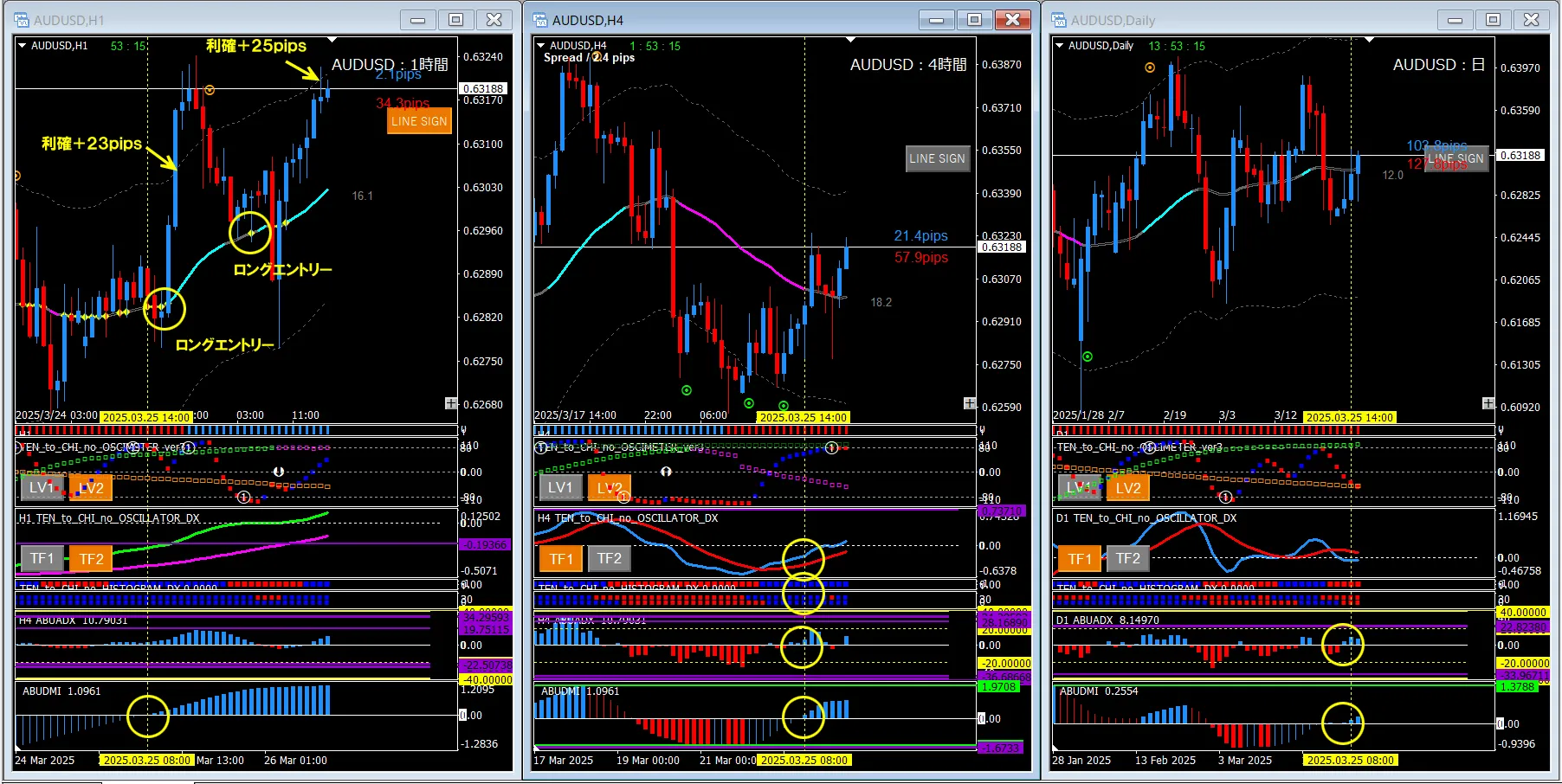 今回は4時間足と日足のABUDMI(Current)をメインに、1時間足、4時間足のヒストグラムDX,DX2の状態を根拠に、1時間足でロングエントリーを狙うトレードです。いつもの根拠であるオシレーターTF1の色転換やオシレーターDXのクロスではないですが、その対象が今回はABUDMIになっただけで、考え方は同じです。