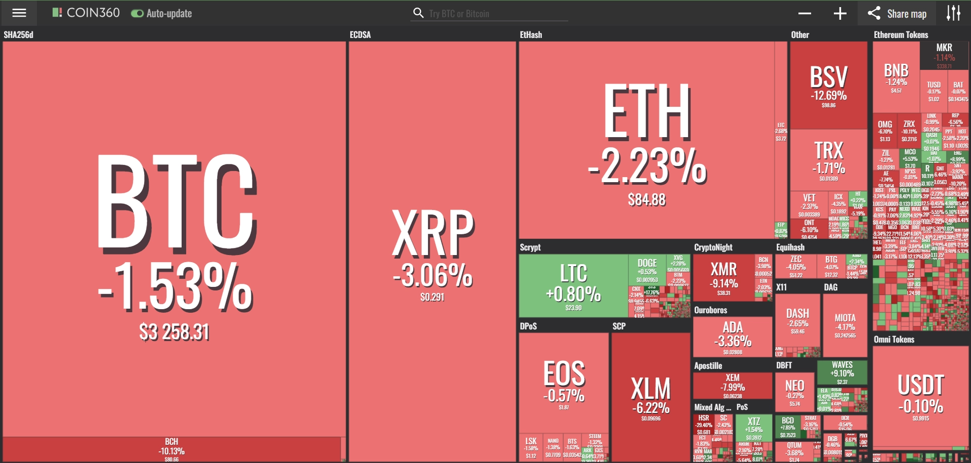 coinmarketcap(コインマーケットキャップ)のサイトから、ドミナンス(各銘柄が仮想通貨全体の時価総額に占めるパーセンテージ)を定点観測していきます。仮想通貨全般が下方向に大きく動き出している相場状況を受け、毎日更新することとし、仮想通貨業界を俯瞰および転換期を早期に発見することを目的とします。