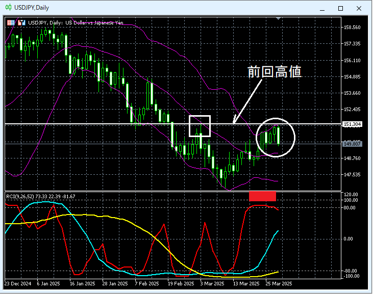上の日足で白い円で囲ったあたりでは、ボリンジャーバンド+2σと前回高値を示すラインが重なるあたりまで上昇していることが分かる。短期RCIであるRCI9が天井圏に張り付いていること(赤色の四角のあたり)を考え合わせると、いったん少し下げる可能性があると考えてもおかしくない場面かもしれない。
