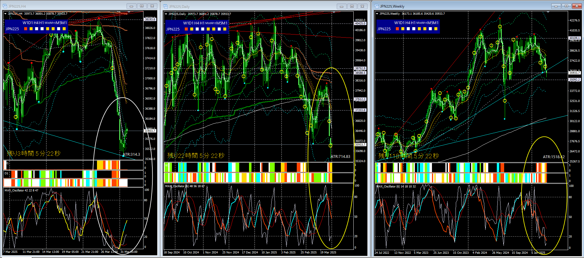 日足のMAXオシレーターは、週足整合の形で下落を示唆