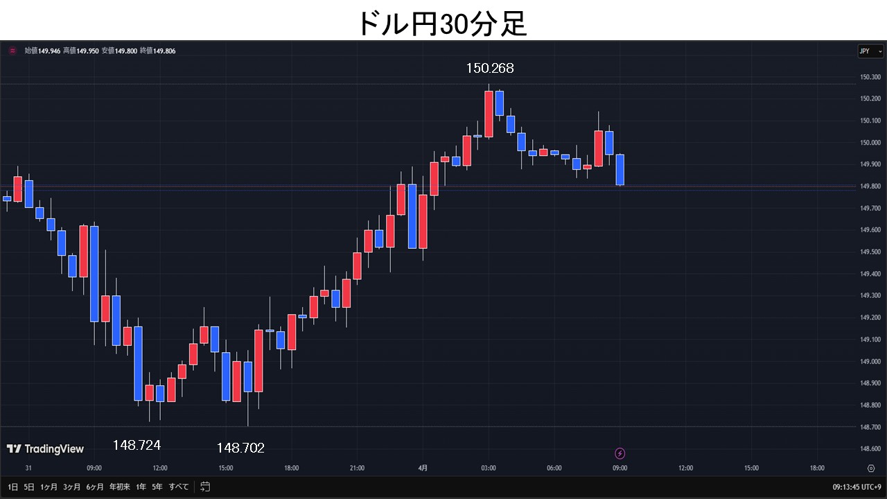 東京時間、前週末の米国株下落を受け、日経平均が急落すると、ドル円は148.72円まで下落。その後買い戻しが入るが、再度148.70円まで下落。欧州時間、ドル円は、低下していた米10年債利回りが低下幅を縮小させた事などを受け買戻しが先行。NY時間、3月米シカゴ購買部協会景気指数が47.6と予想45.0を上回ると、米10年債利回りの上昇・急落していたNYダウ平均の反発などを受け、ドル円は150.26円まで上昇。