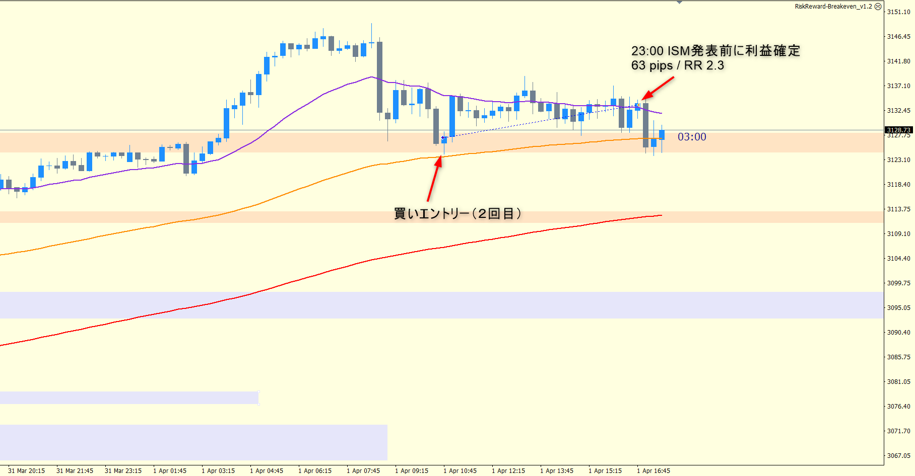 2回目のエントリーは、23:00からの重要経済指標(ISM)の発表前に利益確定(63 pips/ RR 2.3)しました。 (重要指標を持ち越すと、ギャンブルトレードになるので、通常は指標発表前にポジションをクローズします。)