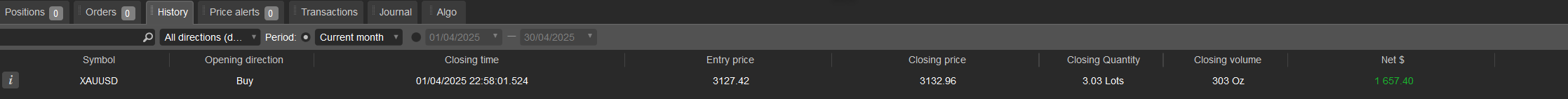 リアルトレード (ゴールド) 2025年4月1日(火) RR -1 -> RR 2.3 (63pips利確) = RR 1.3