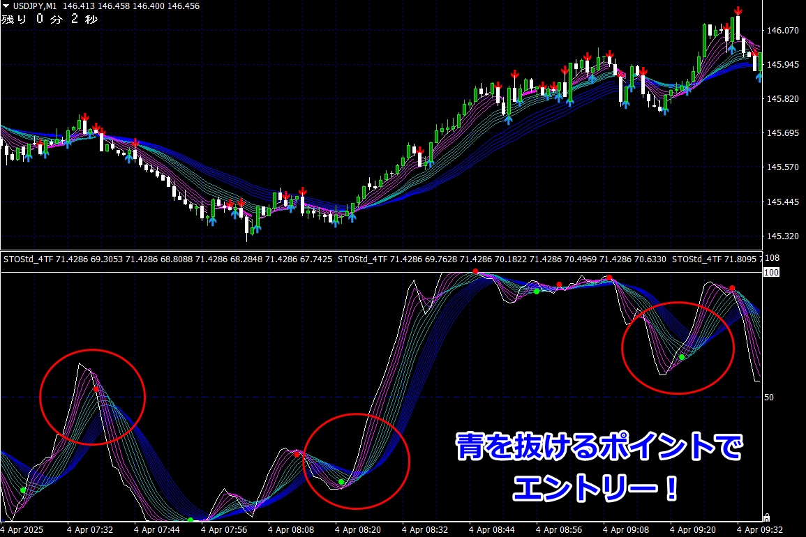 ※ サイン点灯=エントリーではありませんので、インジケーターが緑帯をすくい上げるような形状でない場合は、エントリーしません(サイン点灯でエントリーできる頻度は、数回に1度くらいです)。