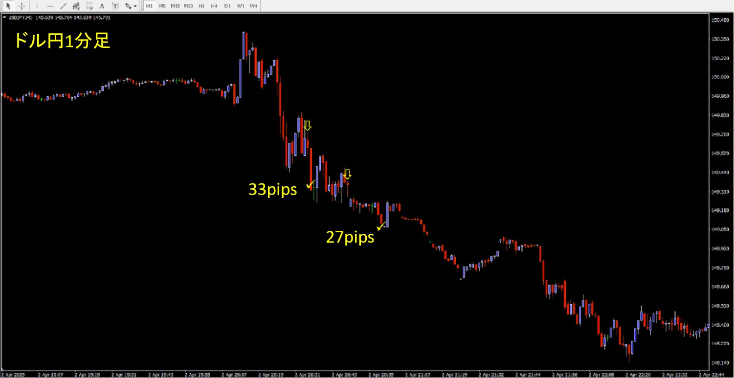 1分足でこれだけ獲れてますから、ボラが大きい相場がいかに有効かわかりますね。