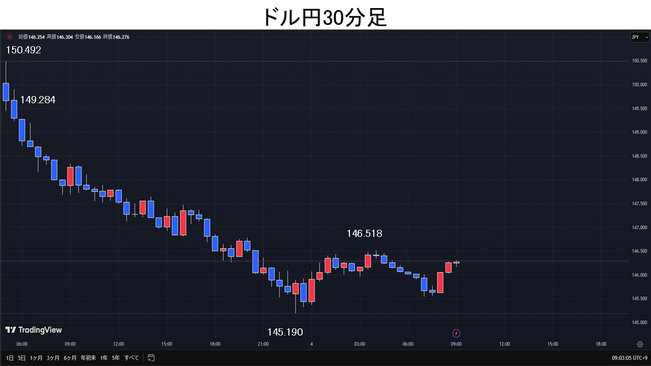 ドル円、相互関税を嫌気したリスク回避の円買いで145円台まで下落。
