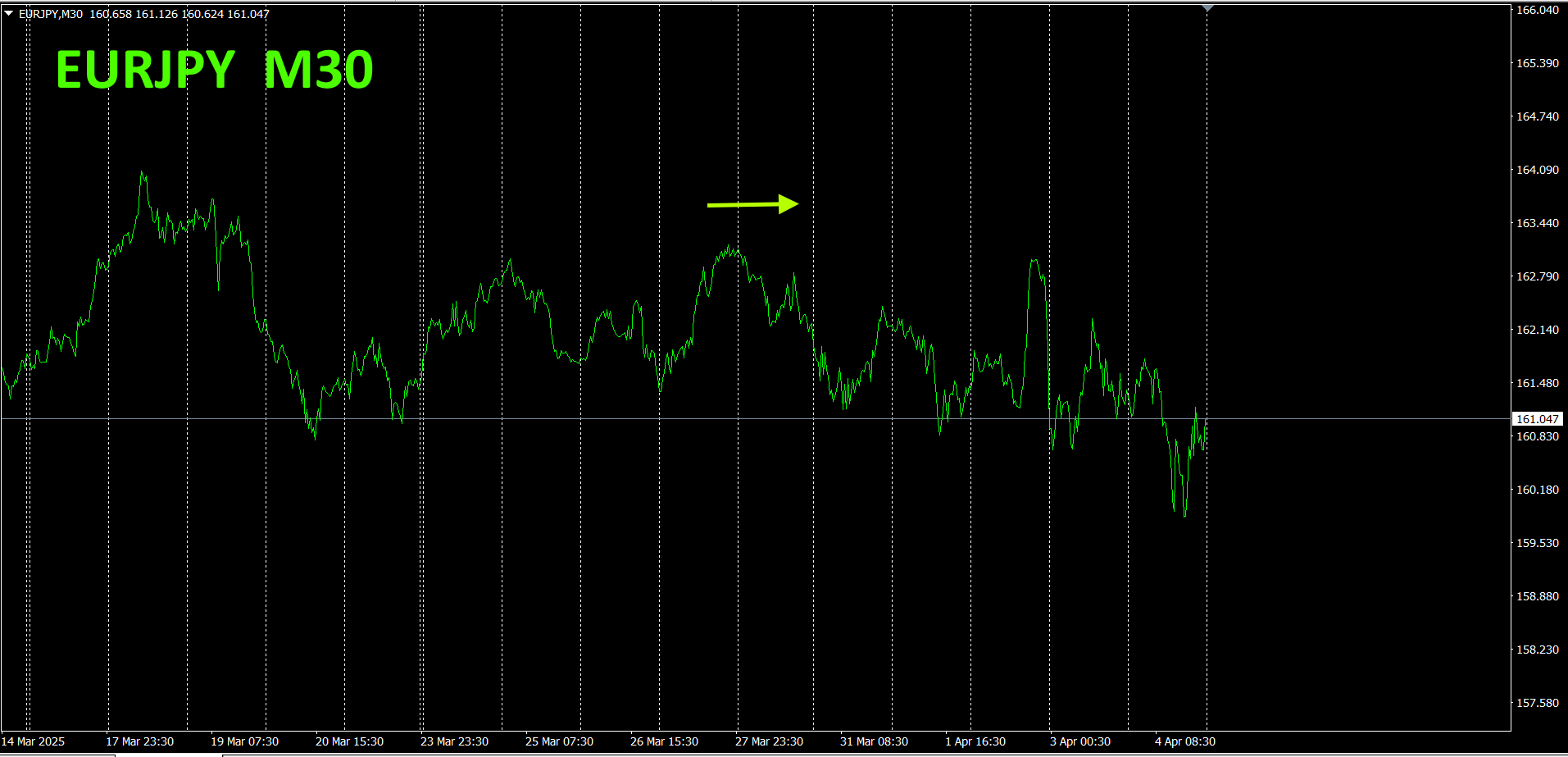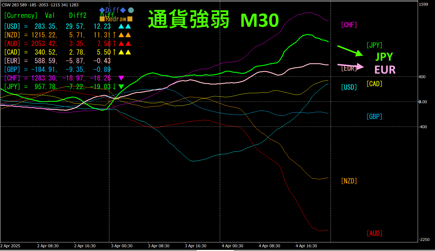 ピンク色がEUR、緑色がJPYです。通貨強弱チャートでは、JPYもEURもどちらもやや下向きになっていますが、角度はEUR>JPYです。従って、EURJPYは、やや上方向に向かうものと考えられます。