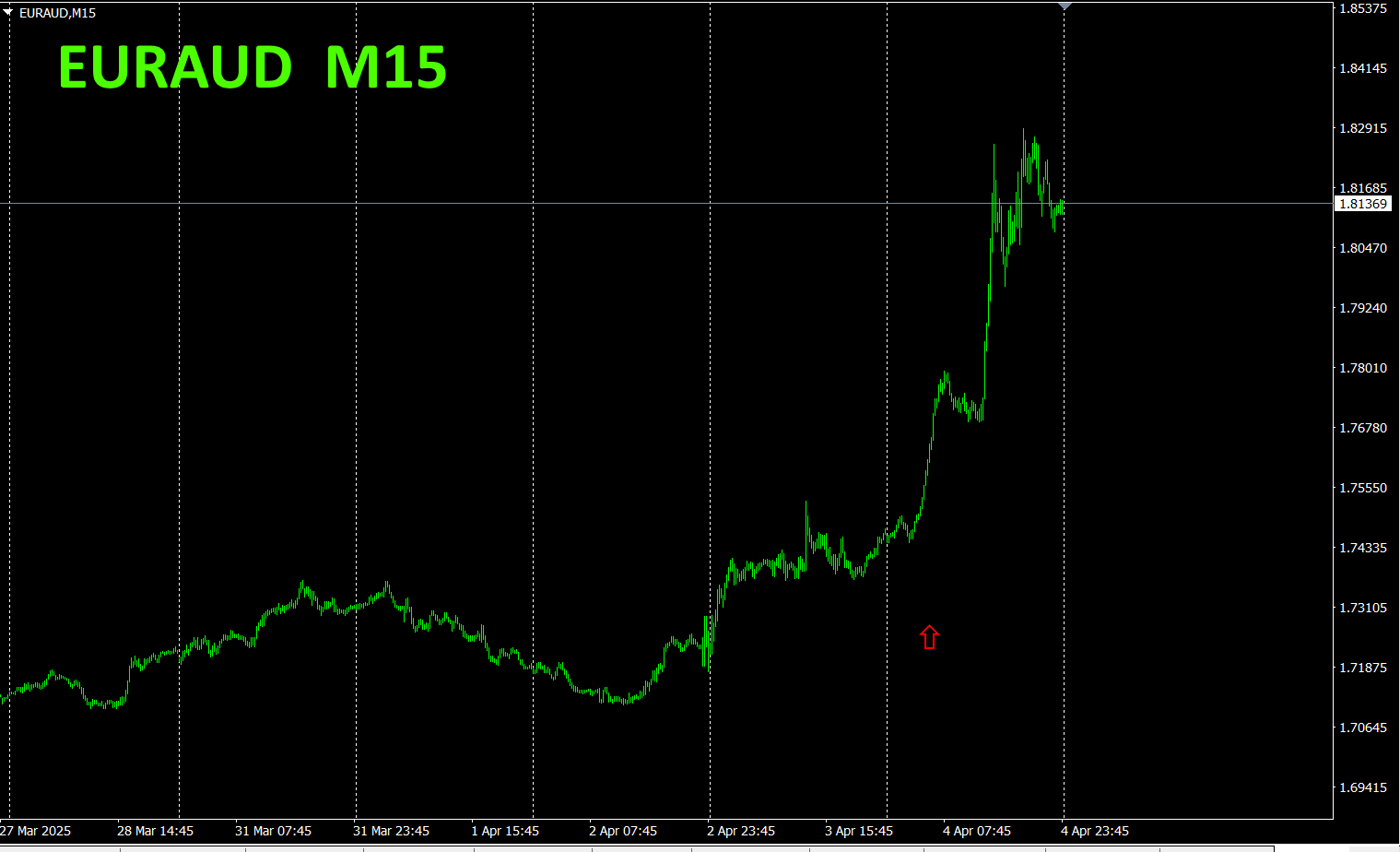 赤色の矢印がスクリーンショットを撮影した所です。上昇トレンド途中の急騰した部分を捉えています。