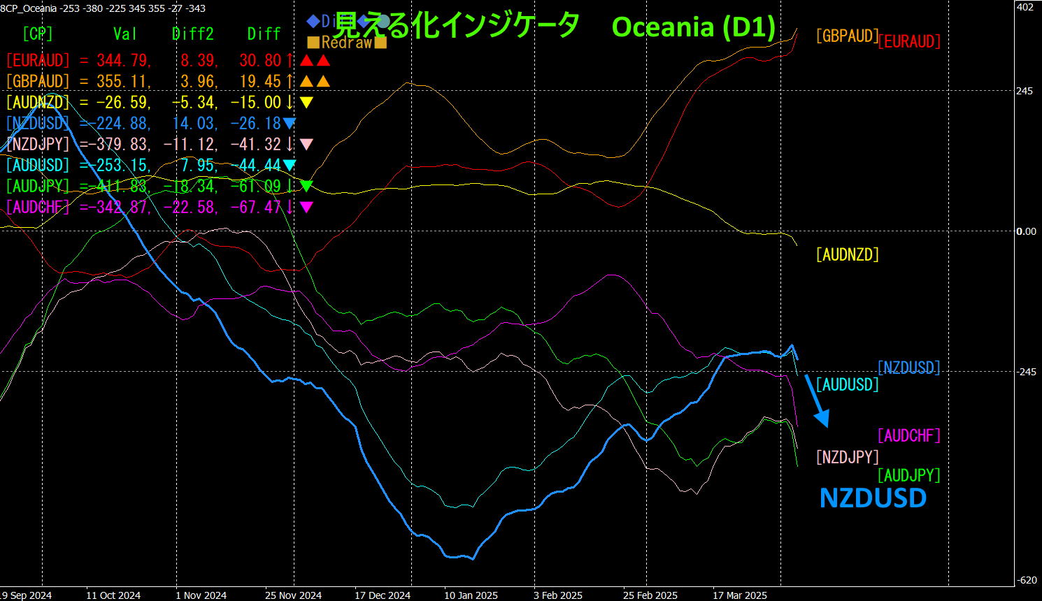下の図は、「8CP見える化インジケータ」Oceania版を日足で表示したものです。