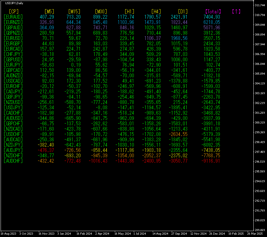 [Total]数値の降順に並んでいます。一番上にあるEURAUDは、全ての時間足で青色の表示色になっています。Total数値が 7404.93と、大きなプラスの数字になっています。EURAUDに著しい上昇トレンドが発生していることが示唆されます。