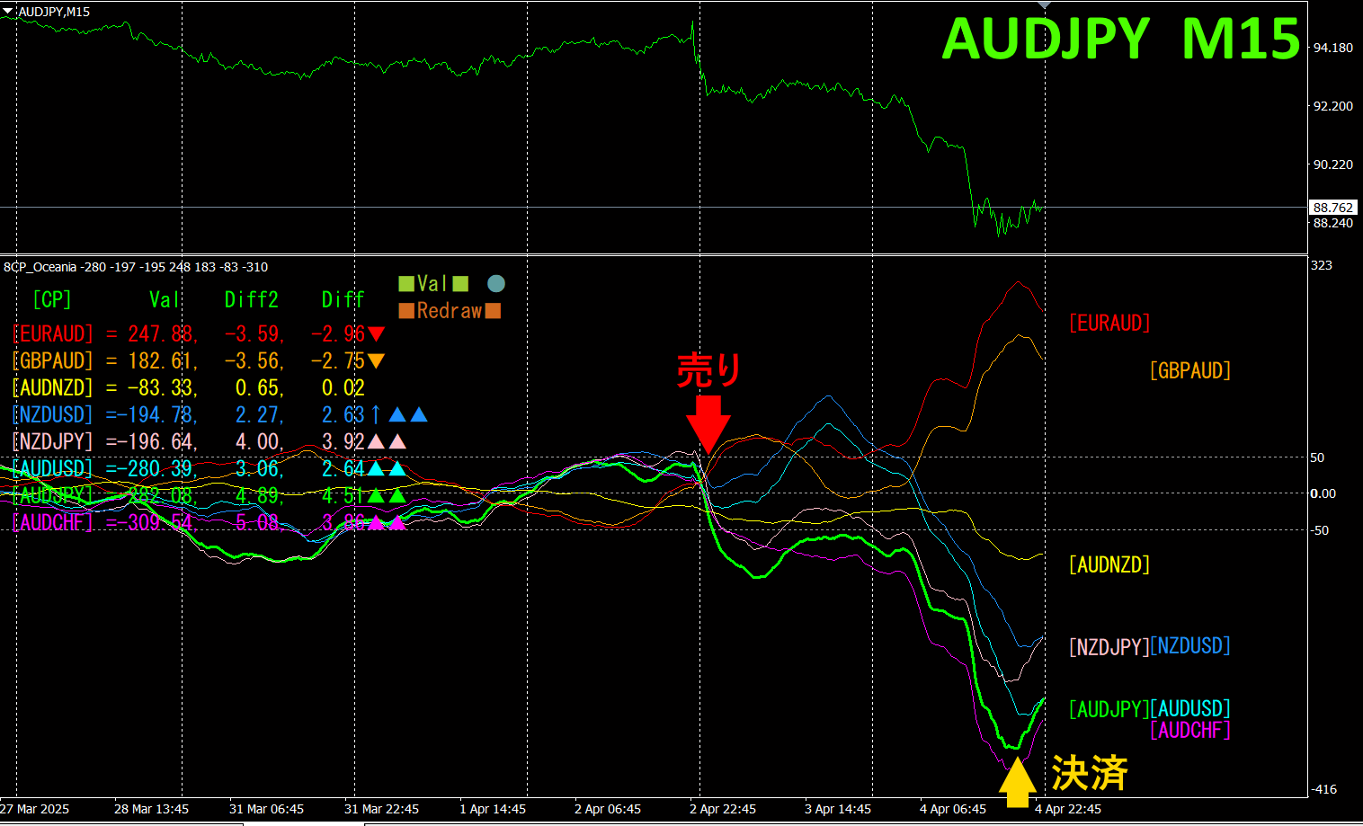 上半分は、AUDJPYの15分足チャートです。下半分は、「8CP見える化インジータ」によるものです、緑色太線のグラフがAUDJPYに相当します。