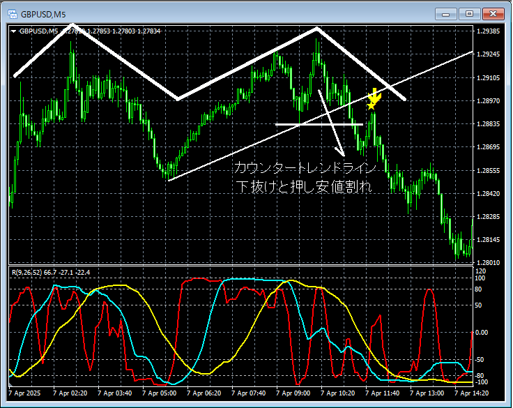 この例から、ダブルトップやダウ理論やカウンタートレンドラインに注目したトレード手法とmBDSRのサインとの親和性の高さがうかがえる。