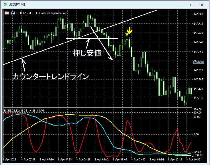 【RCIを極めて勝つ!!】カウンタートレンドラインや押し安値割れとmBDSRの戻り売りサイン