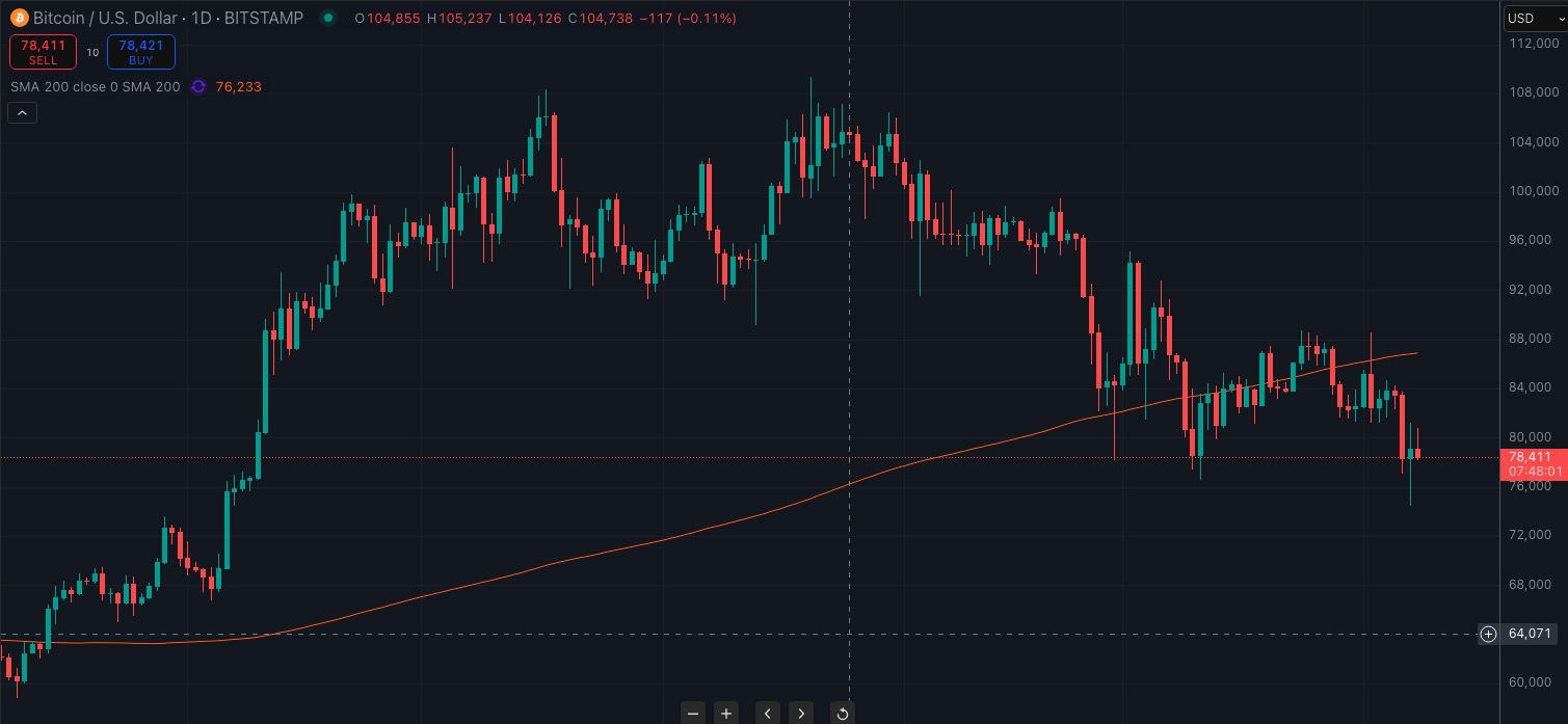 7日以前ではビットコインなどの仮想通貨は株安に対して、下落に耐えていた印象でしたが、7日に入り一気に下落。84000ドルから一気に80000ドルを割り込み、翌8日には一時的に76000ドルを割り込み、現在その後の反発で78000ドル付近で推移をしています。