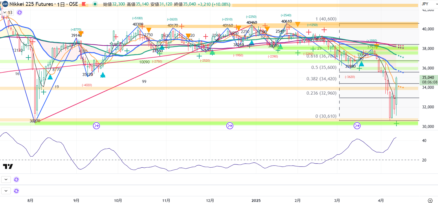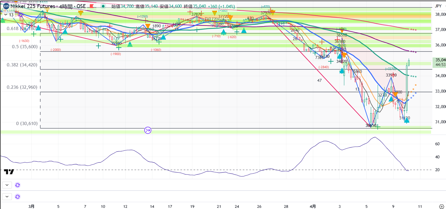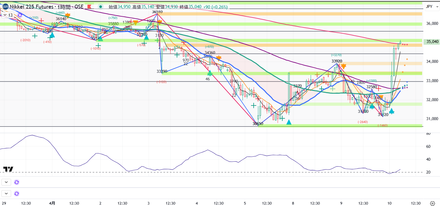 上昇のターゲットは日足での半値戻し水準である35600円。日足20MA、4時間足100MAがらみ。1時間足の超長期249MAをナイトでは超えているが東京時間で超えて推移できるかがポイント。