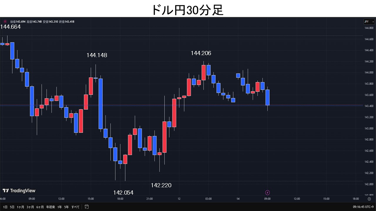 ドル円、米中貿易戦争激化を嫌気し、一時142.05円まで下落。