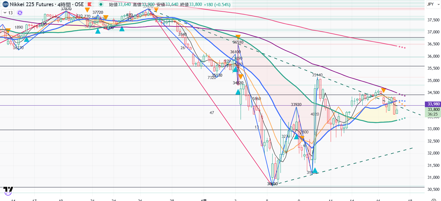4時間足での20MAと50MAの間での価格推移となろう。(34200-33300)