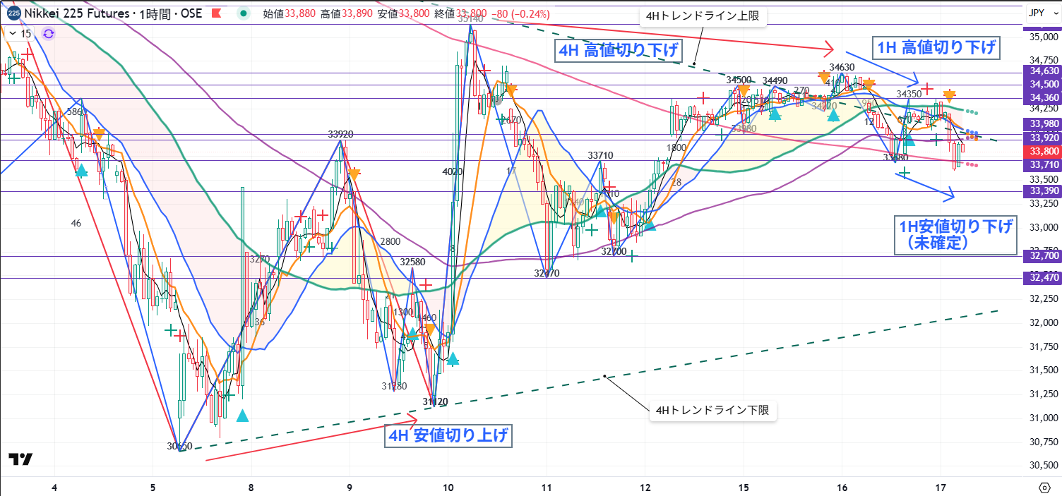 基本は下目線。1時間足での下落の流れを利用しての戻り売り。(34100~34200)ターゲットは33600~33300。