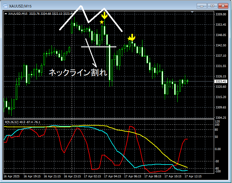 上位足の状況は省略。上の15分足では、まず、形成されるかもしれないダブルトップの右側の山においてmBDSR(RCI2本フィルター)の戻り売りサインが点灯してプライスは下げている。そして、ネックライン割れの後の上昇で再度mBDSR(RCI2本フィルター)の戻り売りサインが点灯してプライスは下げている。