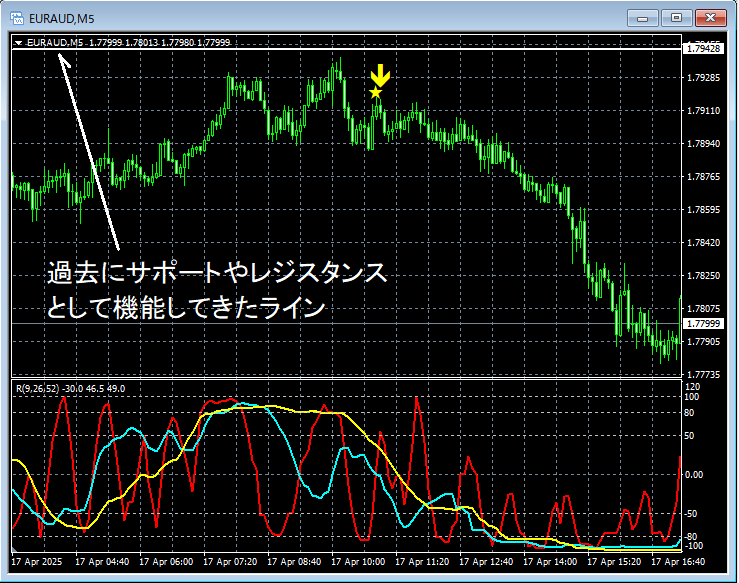 上の5分足を見てみると過去にサポートやレジスタンスとして機能してきたライン付近で反落気味。その後、mBDSR(RCI2本フィルター)の戻り売りサインが点灯してプライスは下げている。