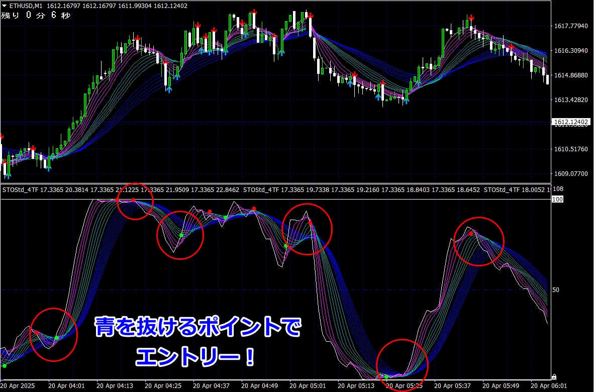 ② 矢印サイン点灯状態で、インジケーターのピンク色の帯が、緑の帯を下からすくい上げるような形状であれば、現在のローソク足が確定する数秒前か確定の直後に1分判定または3分判定でハイエントリーします。