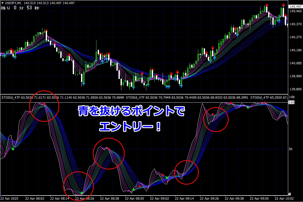 ※ サイン点灯=エントリーではありませんので、インジケーターが緑帯をすくい上げるような形状でない場合は、エントリーしません(サイン点灯でエントリーできる頻度は、数回に1度くらいです)。