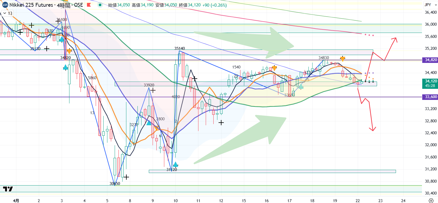 逆に33600を割ってくる動きになれば安値切り下げが確定する動きとなり下落トレンドの開始となるため大きな値幅で下に動くと考える。その場合は15分足でタイミングを計りながらのショートとなる。