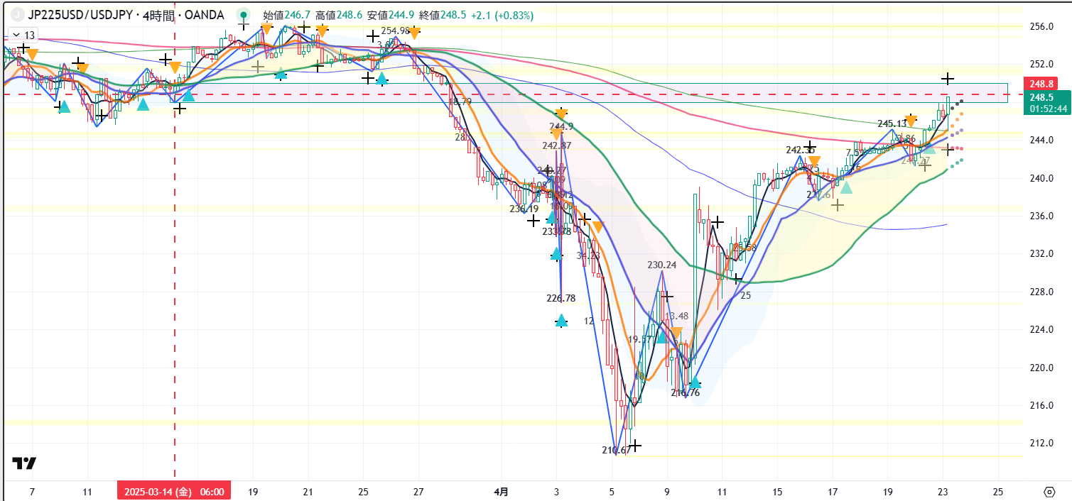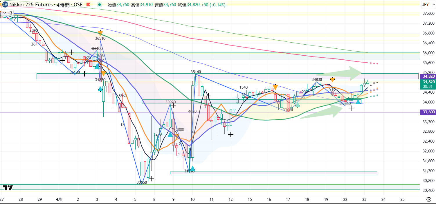 ドル建ては4月14日水準まできているため、ここからの価格の上昇は考えにくいが、逆に円建てである日経は上昇、ドル円が下落する形で同様に4月14日レベルである36000を目指すと想定。(4時間チャート緑の帯あたり)