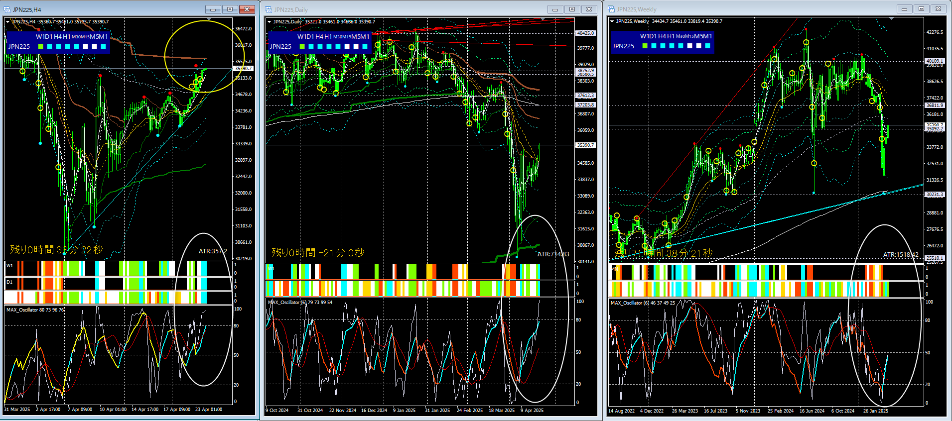 日足のMAXオシレーター・シンクロバンドは現在は「強い上昇」に変化