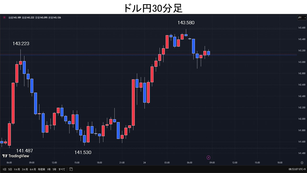 ドル円、米中貿易摩擦緩和期待で143円台半ばまで上昇。
