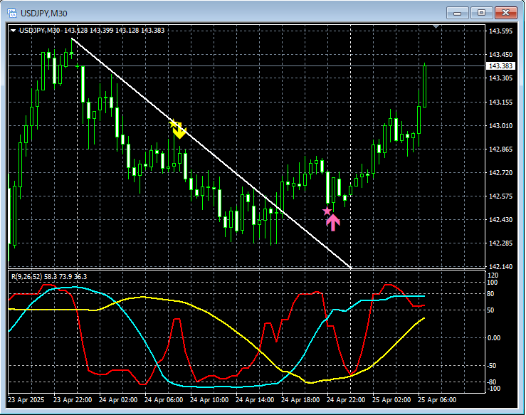 上の30分足を見てみると、カウンタートレンドライン上抜け後の下げでmBDSR(RCI2本フィルター)の押し目買いサインが点灯してプライスはしっかり上昇している。