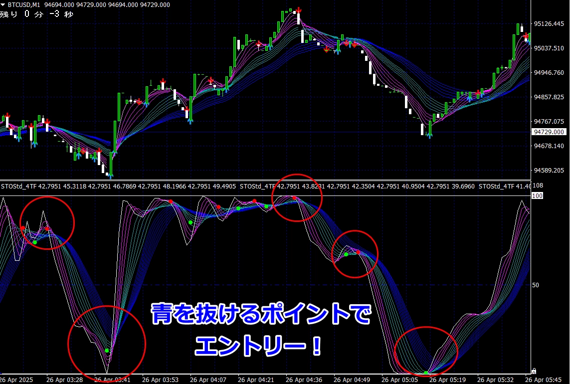 ② 矢印サイン点灯状態で、インジケーターのピンク色の帯が、緑の帯を下からすくい上げるような形状であれば、現在のローソク足が確定する数秒前か確定の直後に1分判定または3分判定でハイエントリーします。