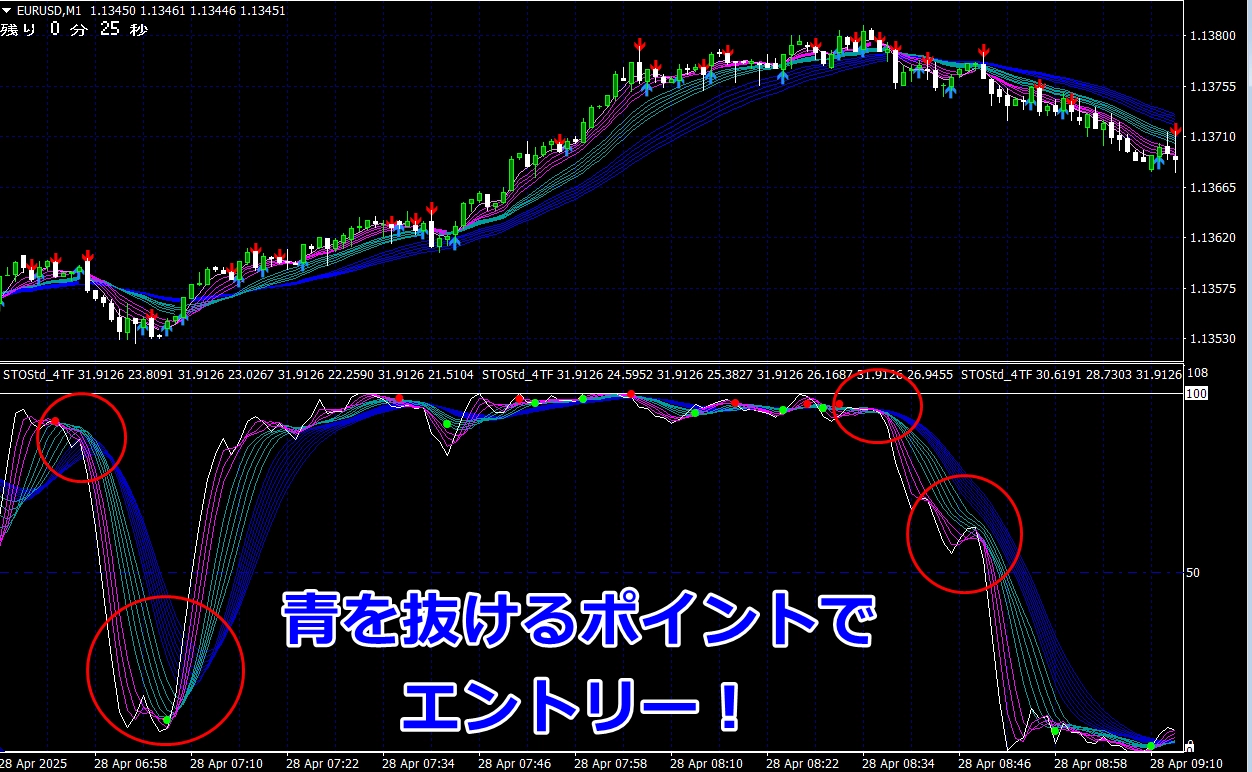 ※ サイン点灯=エントリーではありませんので、インジケーターが緑帯をすくい上げるような形状でない場合は、エントリーしません(サイン点灯でエントリーできる頻度は、数回に1度くらいです)。
