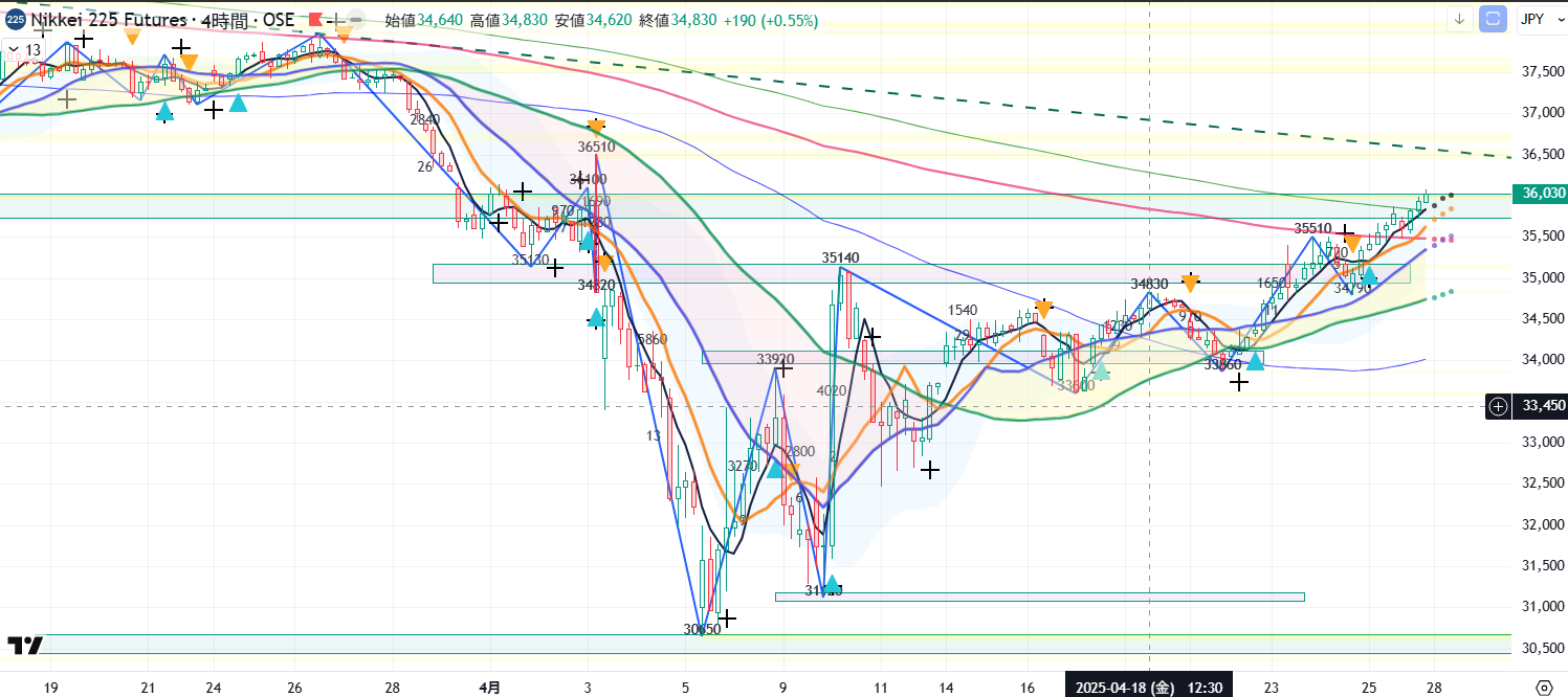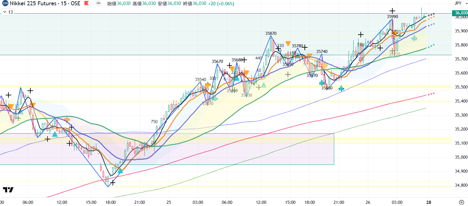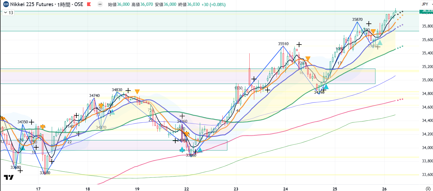 トレンド状況: 高値を更新し、36,000円台での安定した値動き(ナイトセッション)