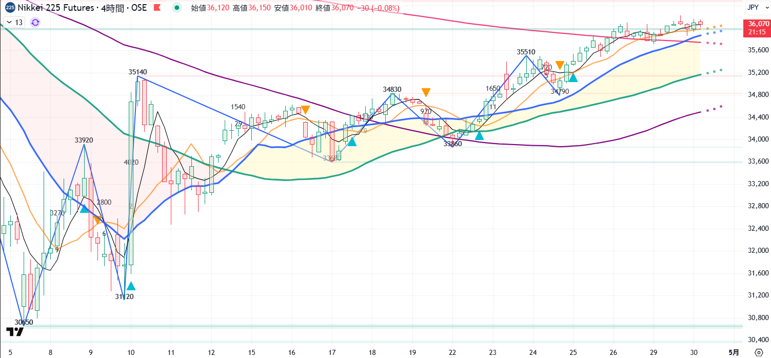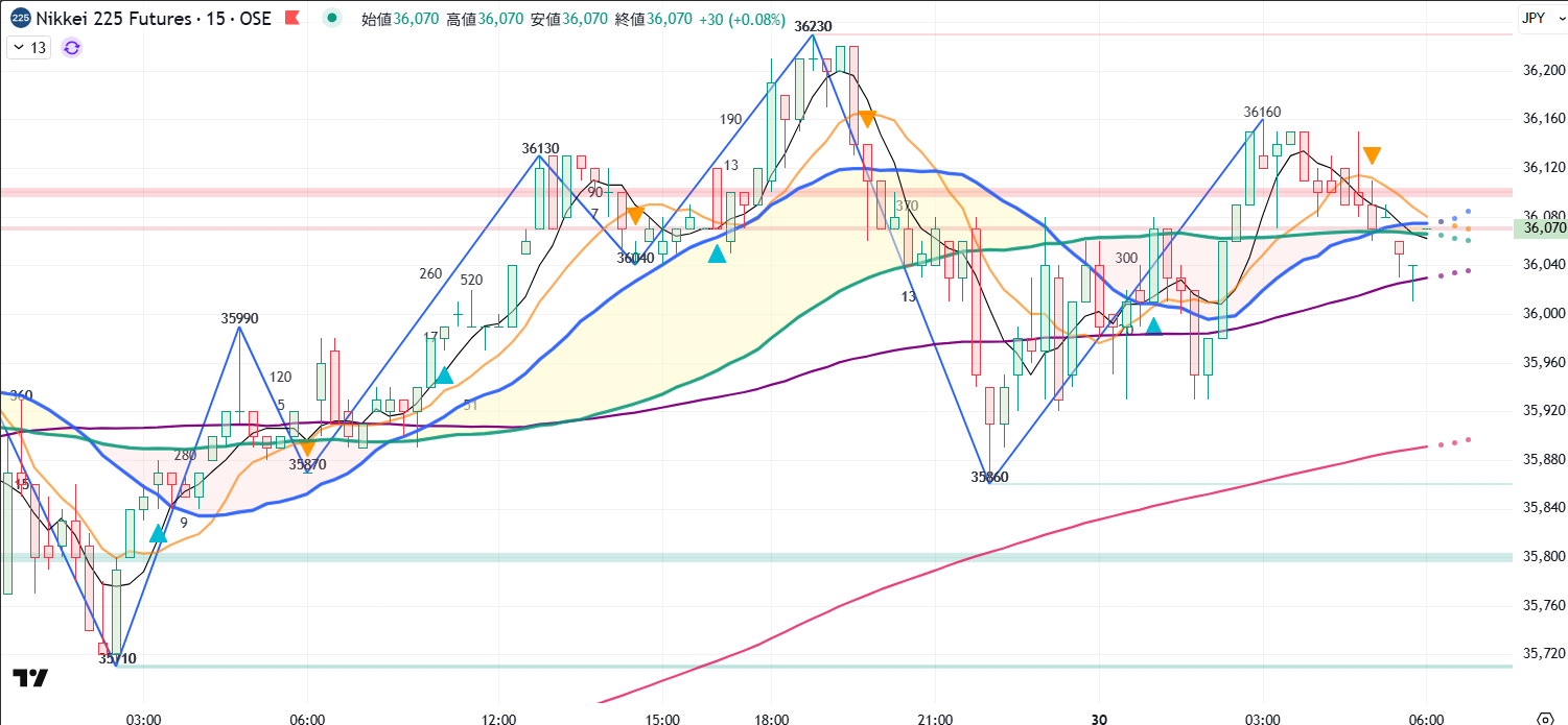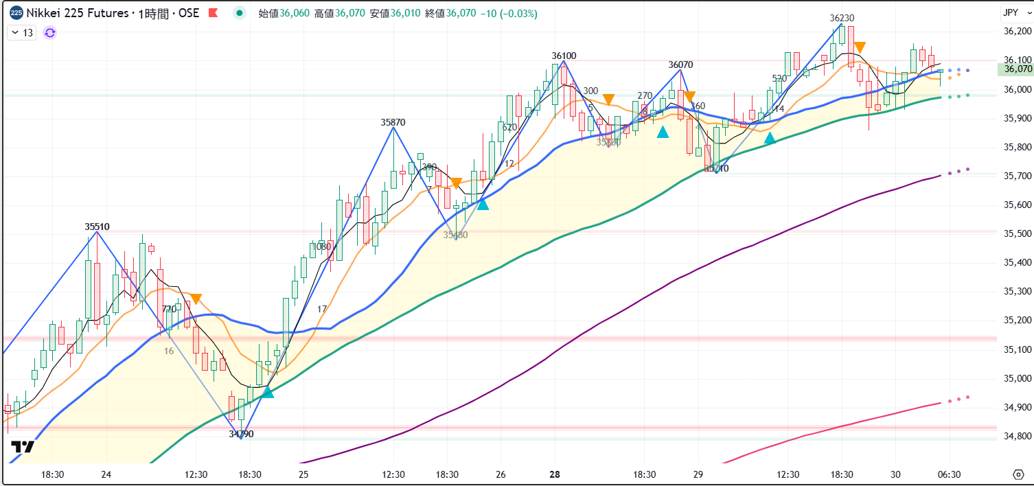 ナイト引けは36070。4時間、1時間ともに上昇トレンドであることから15分足の上昇トレンド転換を待っての押し目買いが基本であるものの日足ベースでは戻りめどとしていた50MAが控えているため36000より上でのエントリーは期待できる値幅が小さいためトレードには適さない。