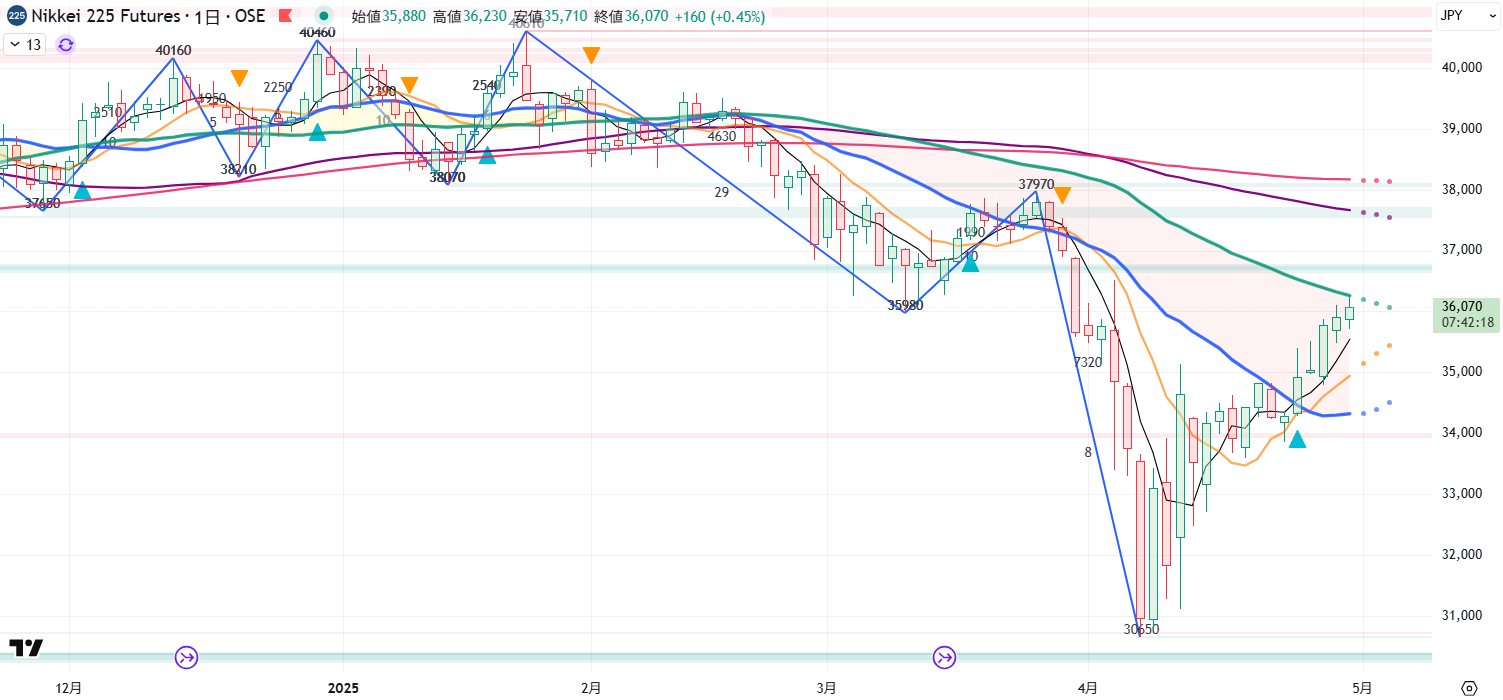 大局観では30650から36230までで約18%戻し、通常の暴落時の戻りは約20%である事から目指しても36700が戻りの最大値となろう。4月10日につけた36510は可能性はあるものの5月初旬に戻り高値を形成し一旦は6~10%程度、値幅で2000円から3000円の日足ベースでの下落(50MA付近)で下を試した後に6,7月に向けて再度今のレベルまでの上昇といった流れになると想定。