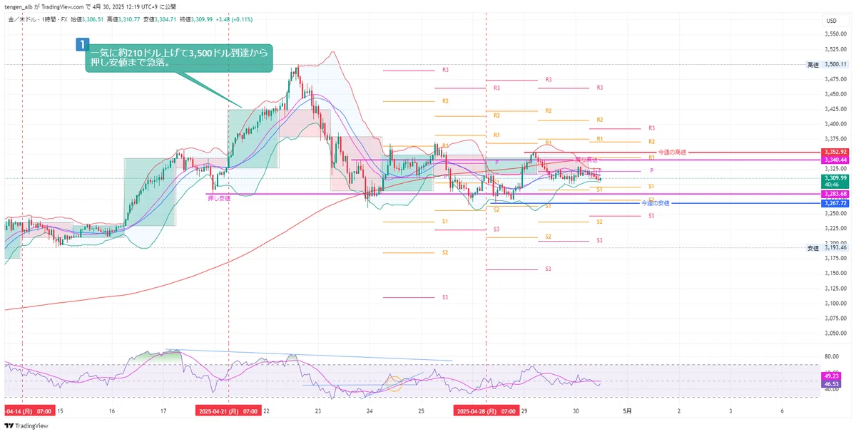 しかし3,500ドルという節目に到達したことで利益確定売りが入り、日足では上ヒゲ陰線を形成し反落。