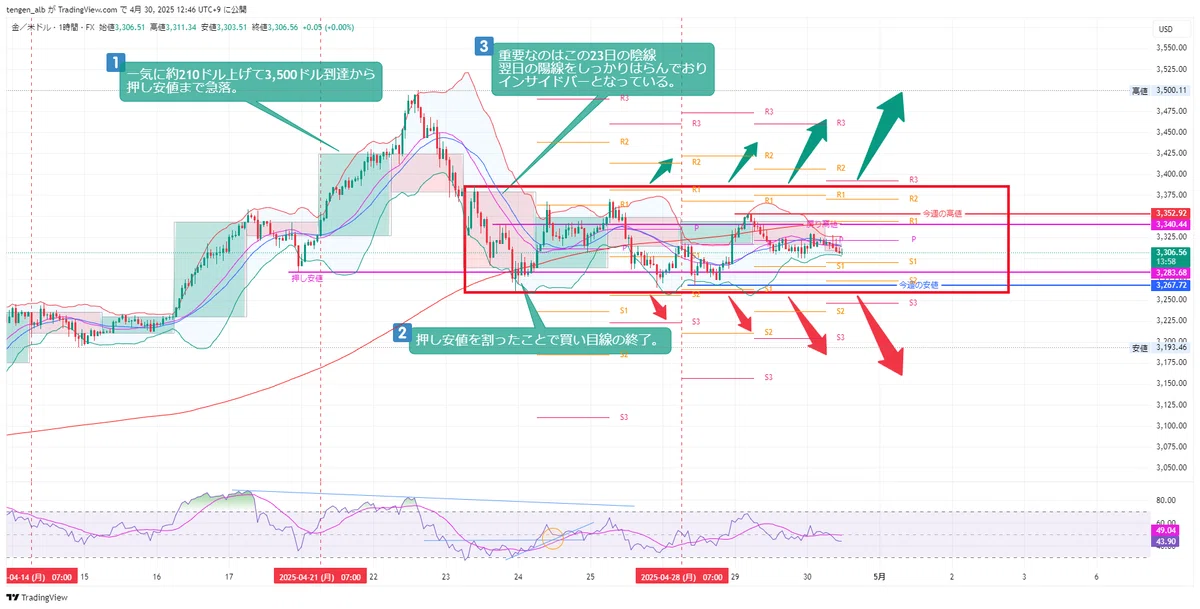 押し安値を割った最安値形成足から4月30日12時の足で1時間足のロウソクで数えれば実に104本のロウソク足が23日の日足の高安値に収まっている。
