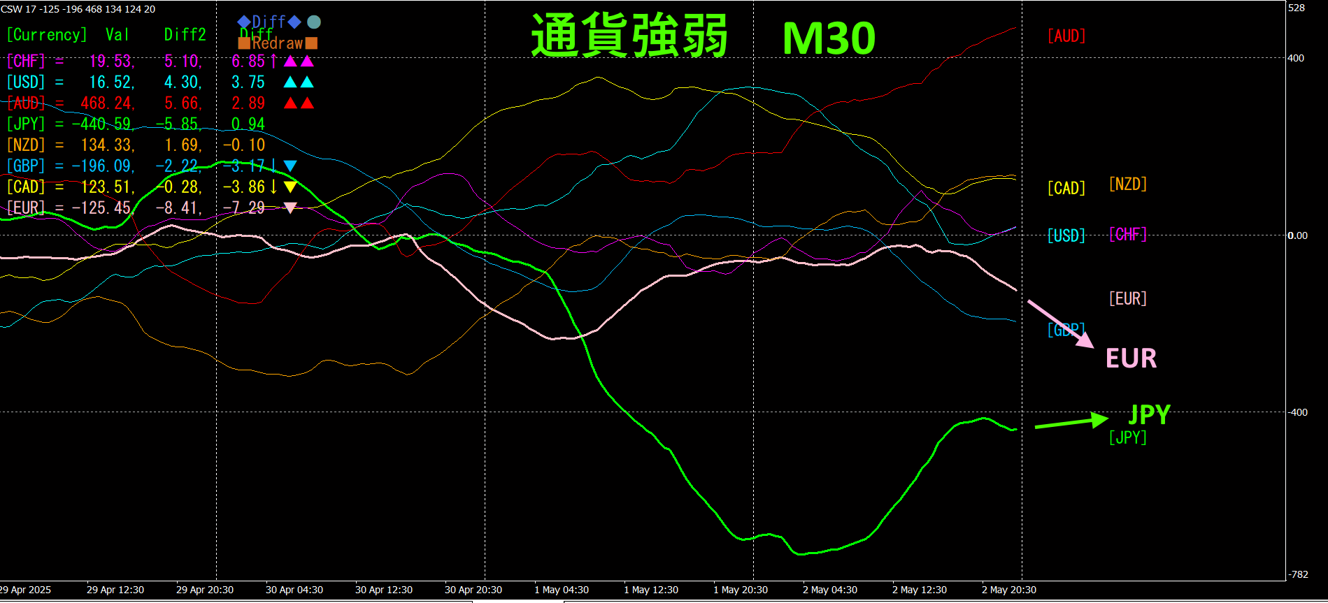 ピンク色がEUR、緑色がJPYです。通貨強弱チャートで直近の方向は、JPYが水平からやや上、EURが下向きになっています。従って、EURJPYは、やや下降傾向に推移すると考えられます。