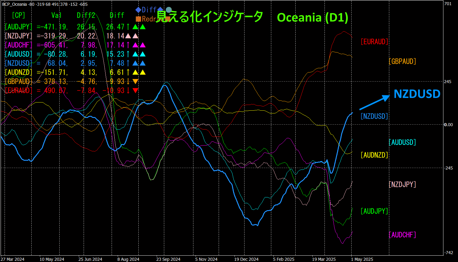 下の図は、「8CP見える化インジケータ」Oceania版を日足で表示したものです。