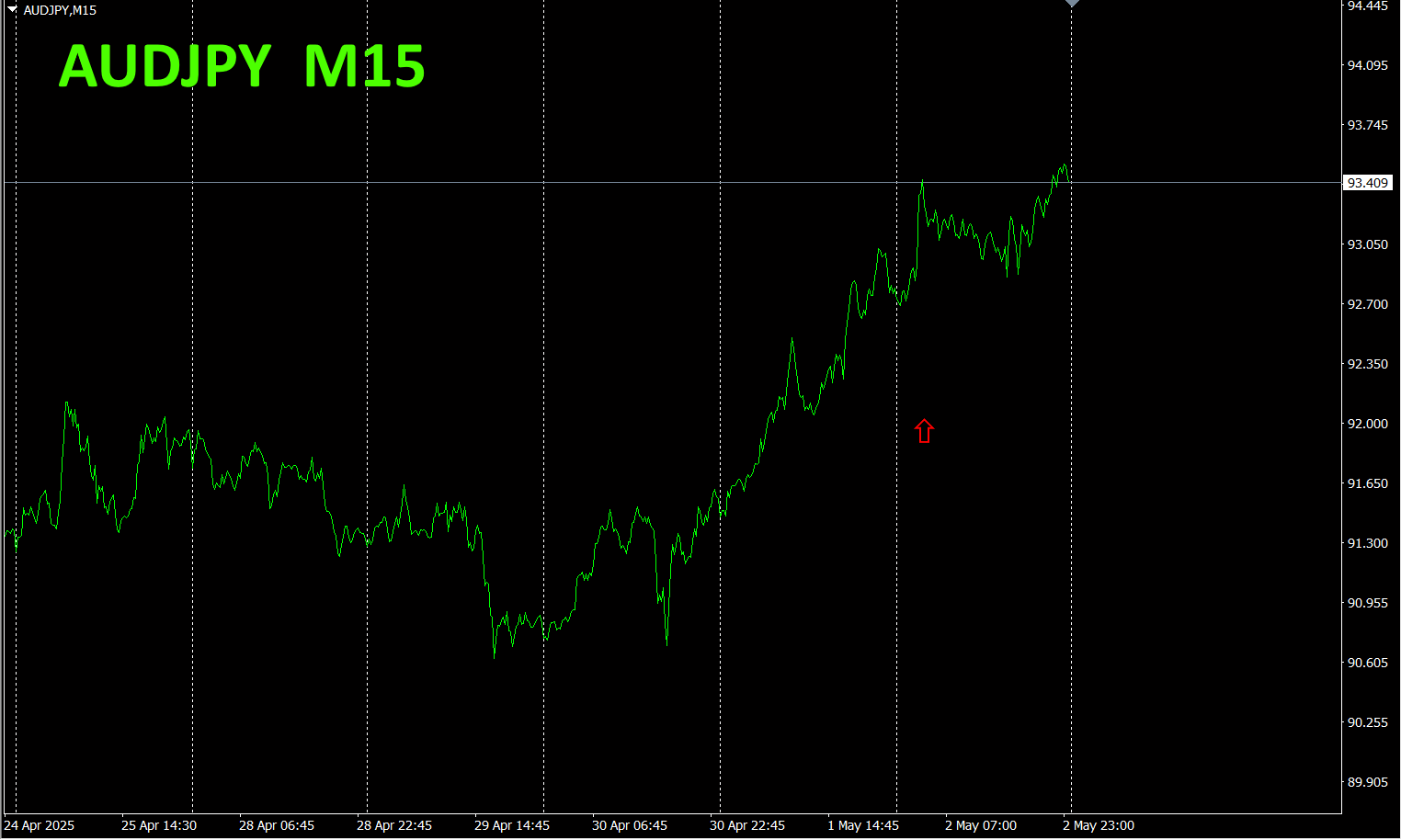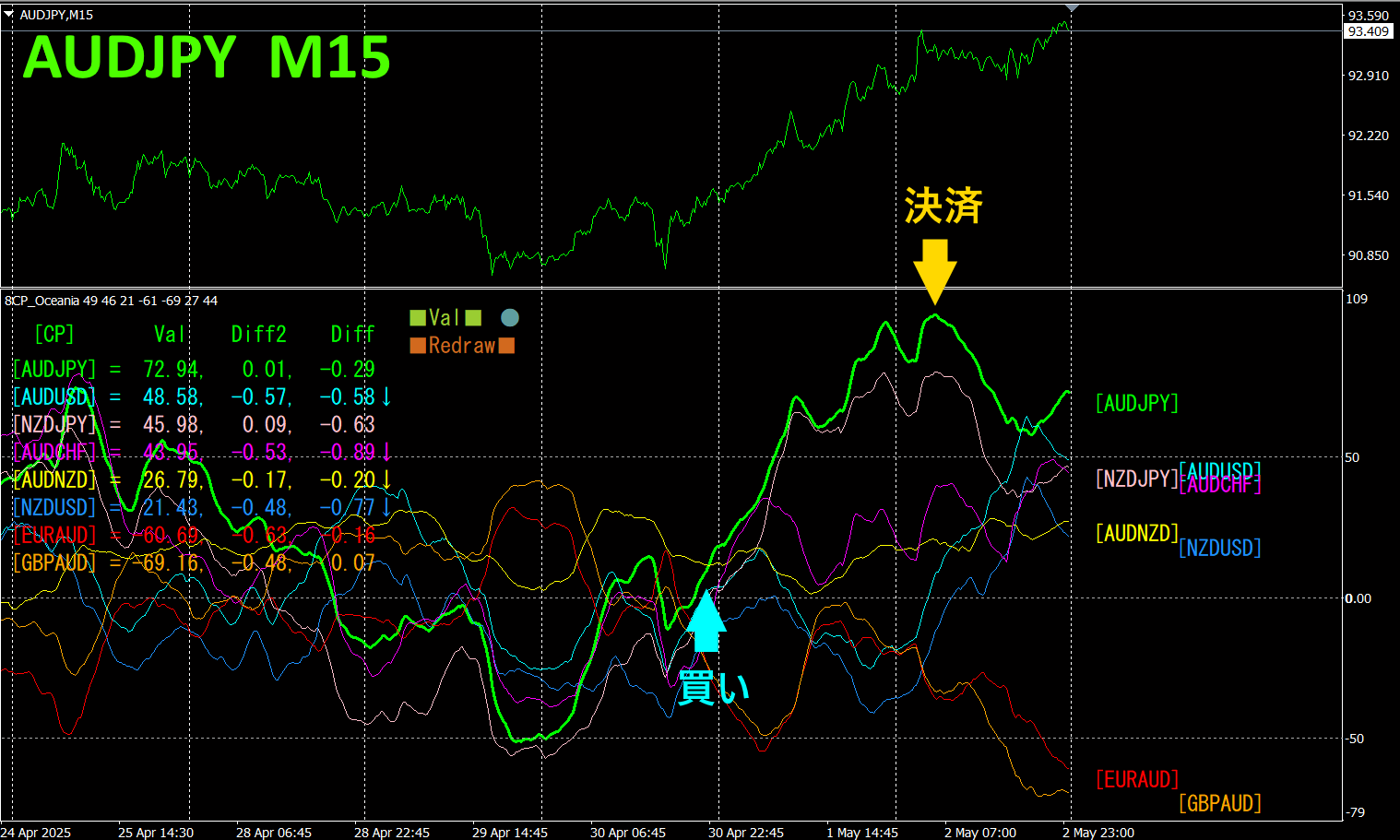 上半分は、AUDJPYの15分足チャートです。下半分は、「8CP見える化インジータ」によるものです、緑色太線のグラフがAUDJPYに相当します。