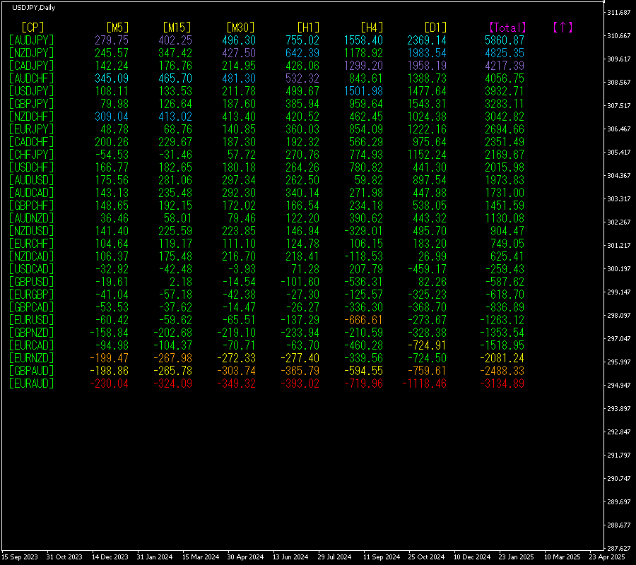 [Total]数値の降順に並んでいます。一番上にあるAUDJPYは、全ての時間足で青色系の表示色になっています。Total数値が 5860.87 と、大きなプラスの数字になっています。AUDJPYに著しい上昇トレンドが発生していることがわかります。