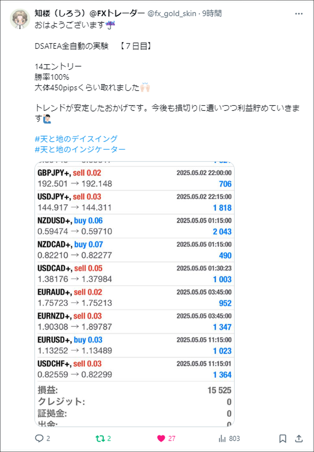 この方法を知った時は、まず「なるほど。こんなやり方もあったか」と感心しました。一つの通貨ペア内でロング用とショート用それぞれにDSATEAをセットするという意図は元々は無かったので、DSATEAの可能性を更に広げてくれた知楼さんには本当に感謝です。こういう事がある度に、自分の手法を公開して本当に良かったと改めて思います。