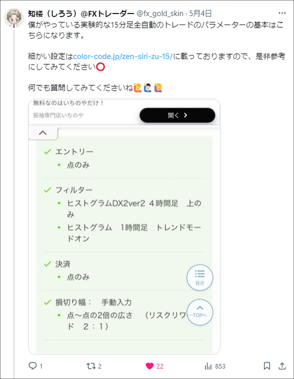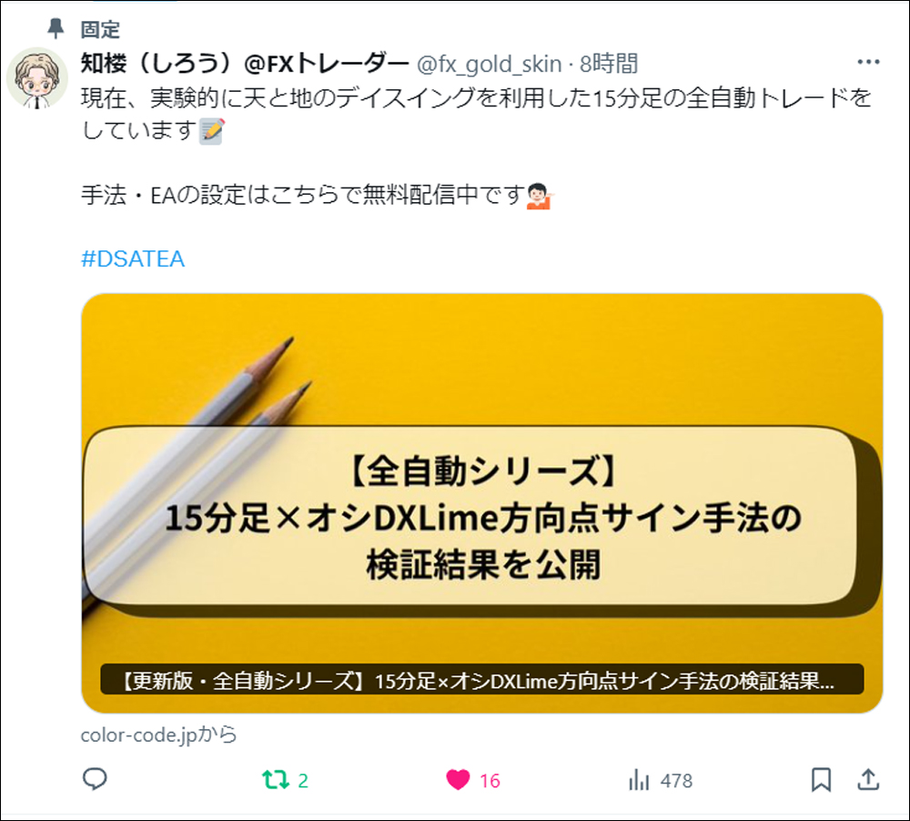 天と地のインジケーター、デイスイングの検証ブログを書いてくださっているユーザー様の「知楼(しろう)@FXトレーダー」さんが編み出した「15分足でDSATEAを完全放置で使用する方法」