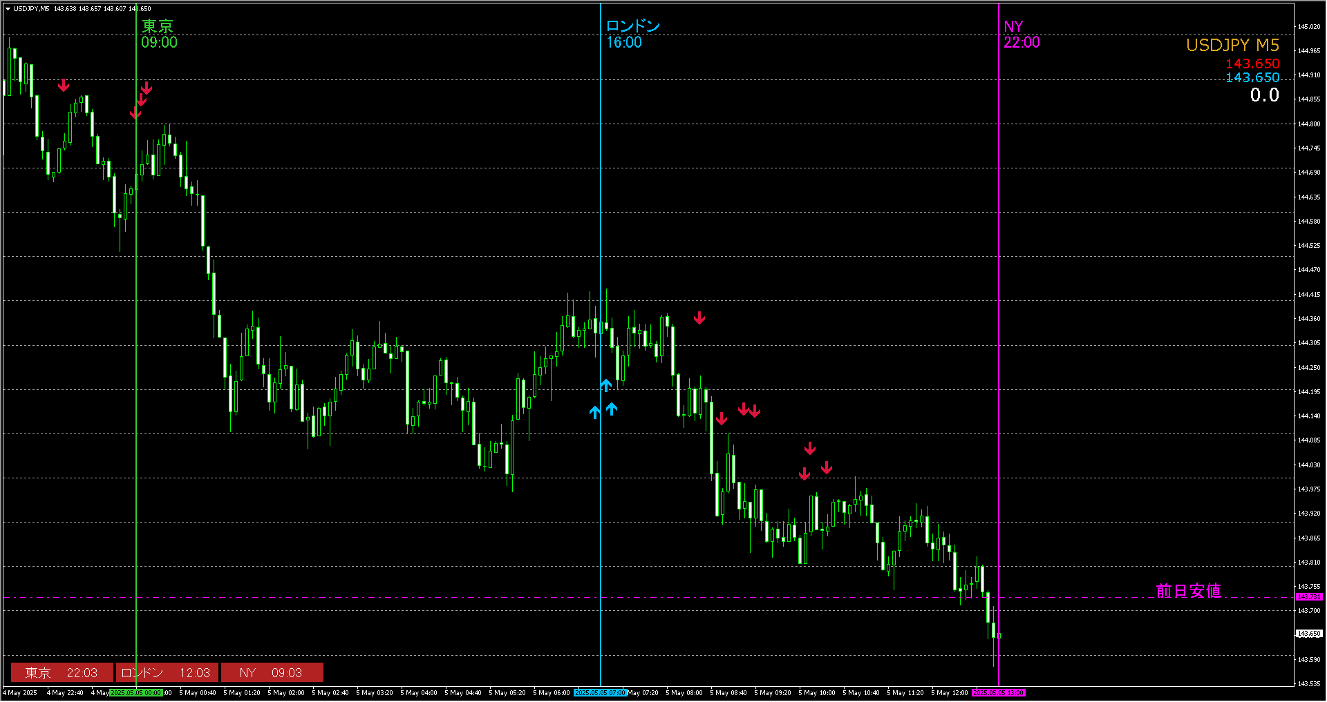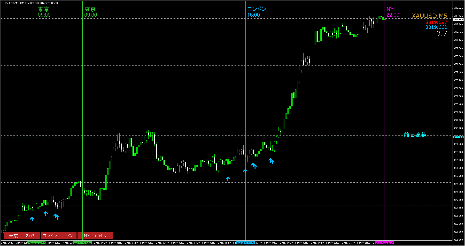 そして現在準備中の「爆誕スペシャルインジケーター」ですが、月曜日にドル円とゴールドの5分足で検証をしました。