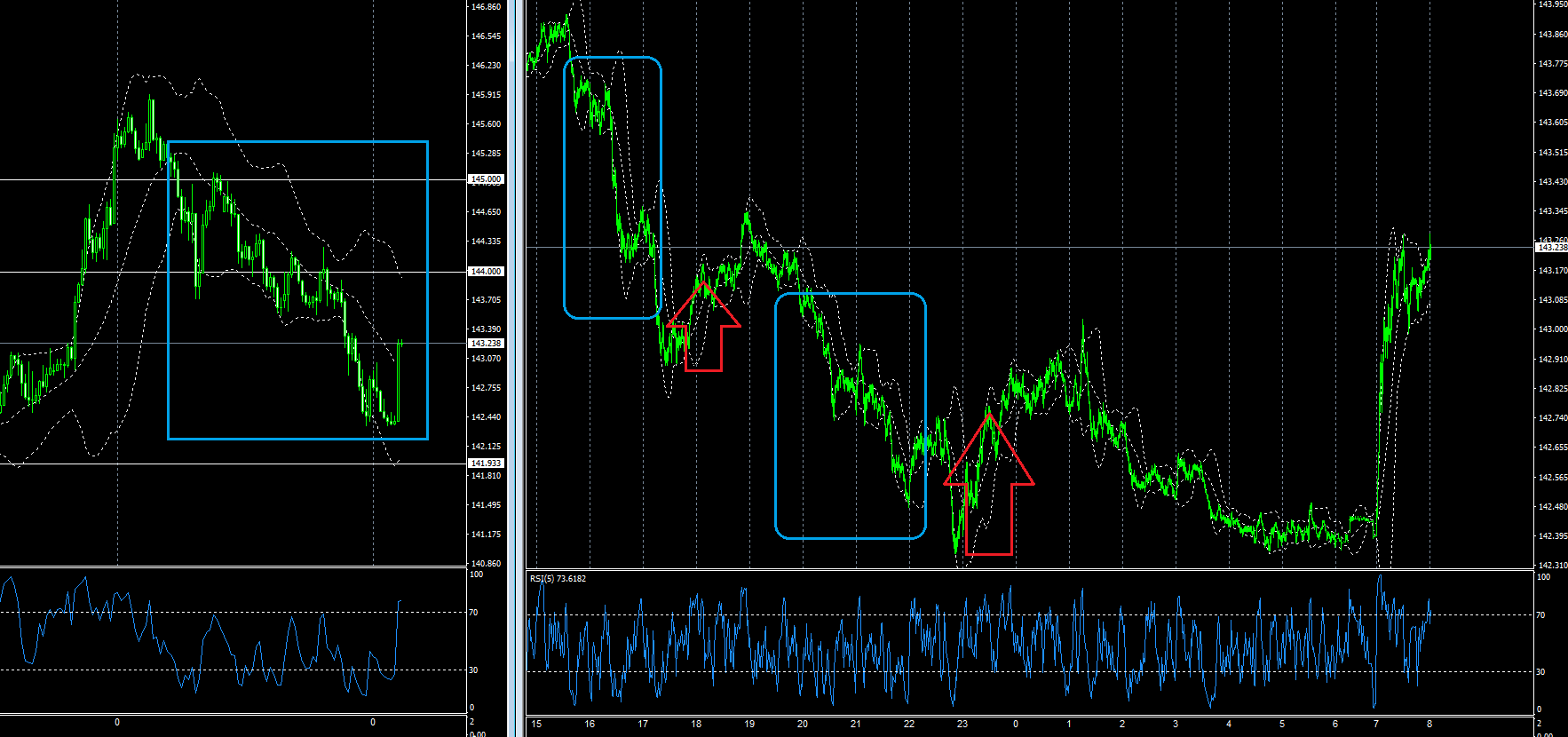 この様に書くと、Bバンドのプラマイ2や3に到達したら逆張り・反転などと言う人が居ますが、それはあくまで結果論です。